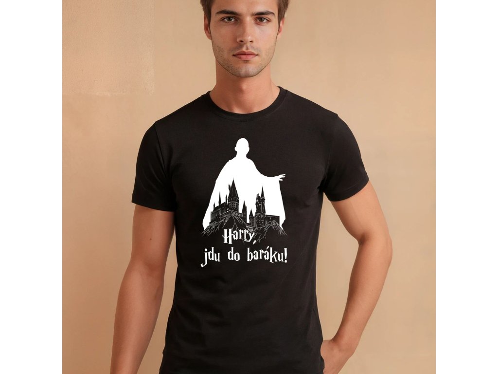 ☕️ Tričko pánské s nápisem "Harry!!! jdu do baráku" a siluetou Voldemorta