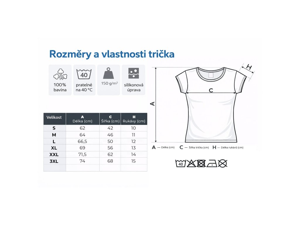 Pro delší životnost doporučujeme prát tričko naruby na 30–40 °C, bez aviváže a agresivní chemie. Vhodný je jemný prací program, sušení na vzduchu a žehlení naruby nebo přes látku, nikdy přímo přes potisk.